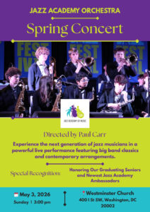 The Spring Concert will be held at Westminster Church in Washington, DC on May 3, 2026.